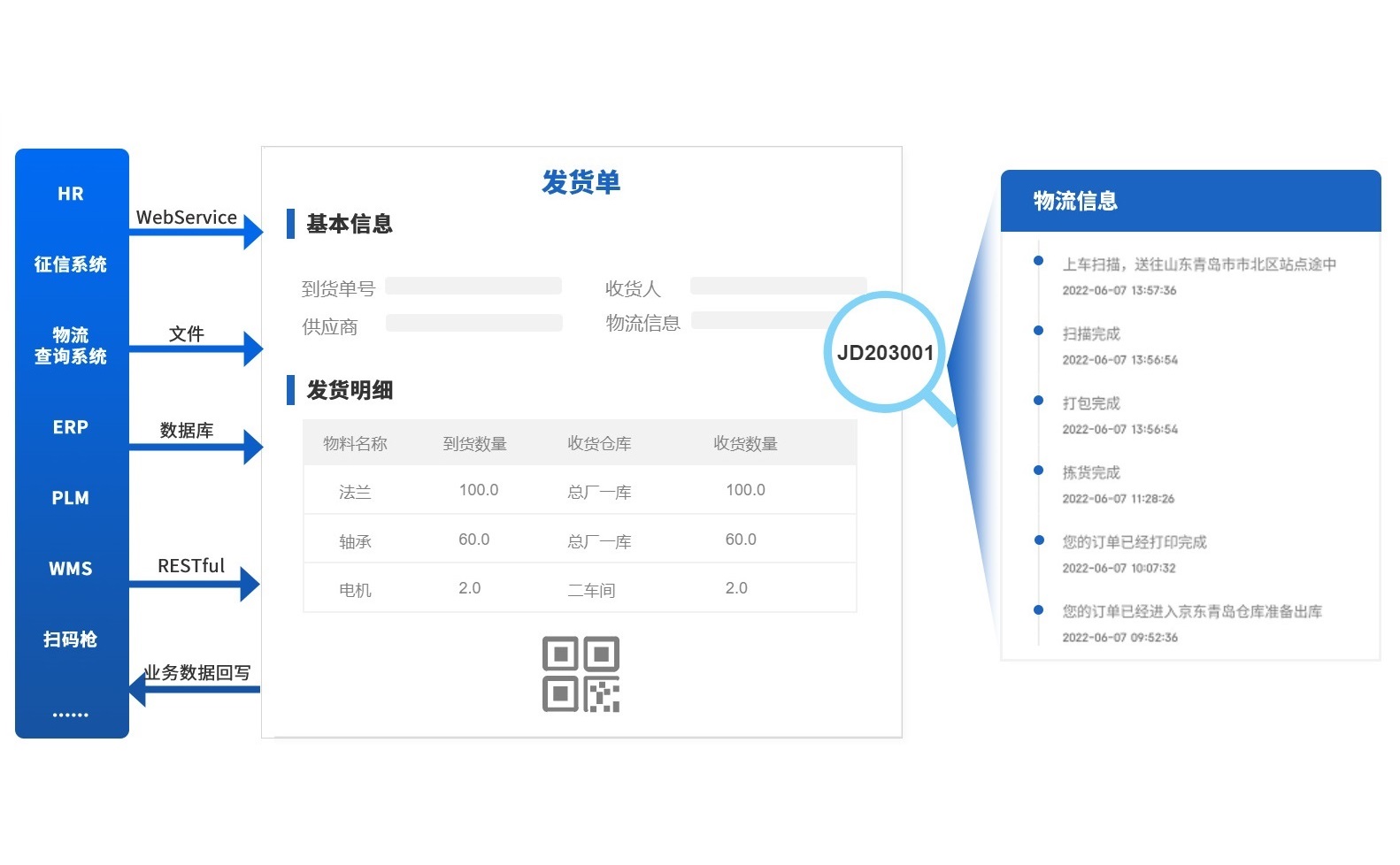 集成ERP、PLM、MES、HR系统、BI报表、WMS、物流系统等,实现业务流程贯通。