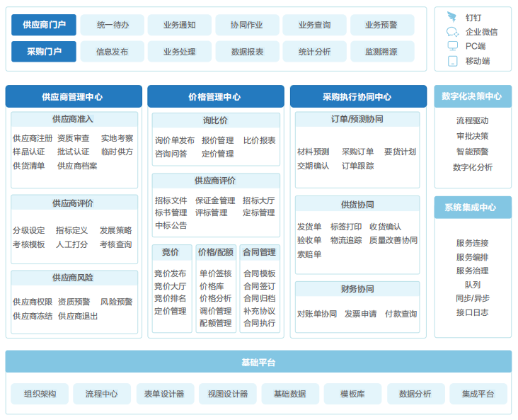 正远SRM为企业打造一个内外统一的采供平台,包括供应商管理中心、价格管理中心、采购协同中心、数字化决策中心、系统集成中心五大平台,保障采购实现“花对钱、少花钱”的目标,让采购成为企业的价值创造中心。