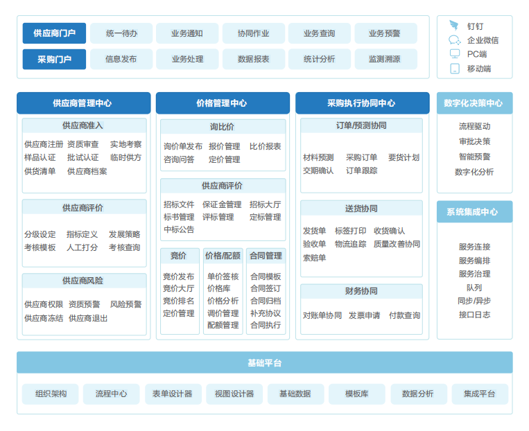 正远SRM数字化采购解决方案,面向传统采购模式中供应商管理松散,采购流程长、周期长,信息不透明,成本和质量不可控的采购难题,为企业打造一个内外统一的采供平台,实现采购业务的量化和可视化管理,助力企业综合提效降本。