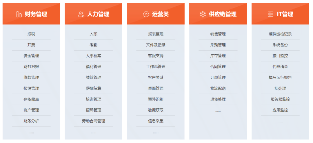 RPA机器人通过AI技术模拟人类行为,面向财务管理、人力资源管理、运营类管理、供应链管理、IT管理等领域,完成大批量、高重复性工作任务,可提升工作效率几十倍。
