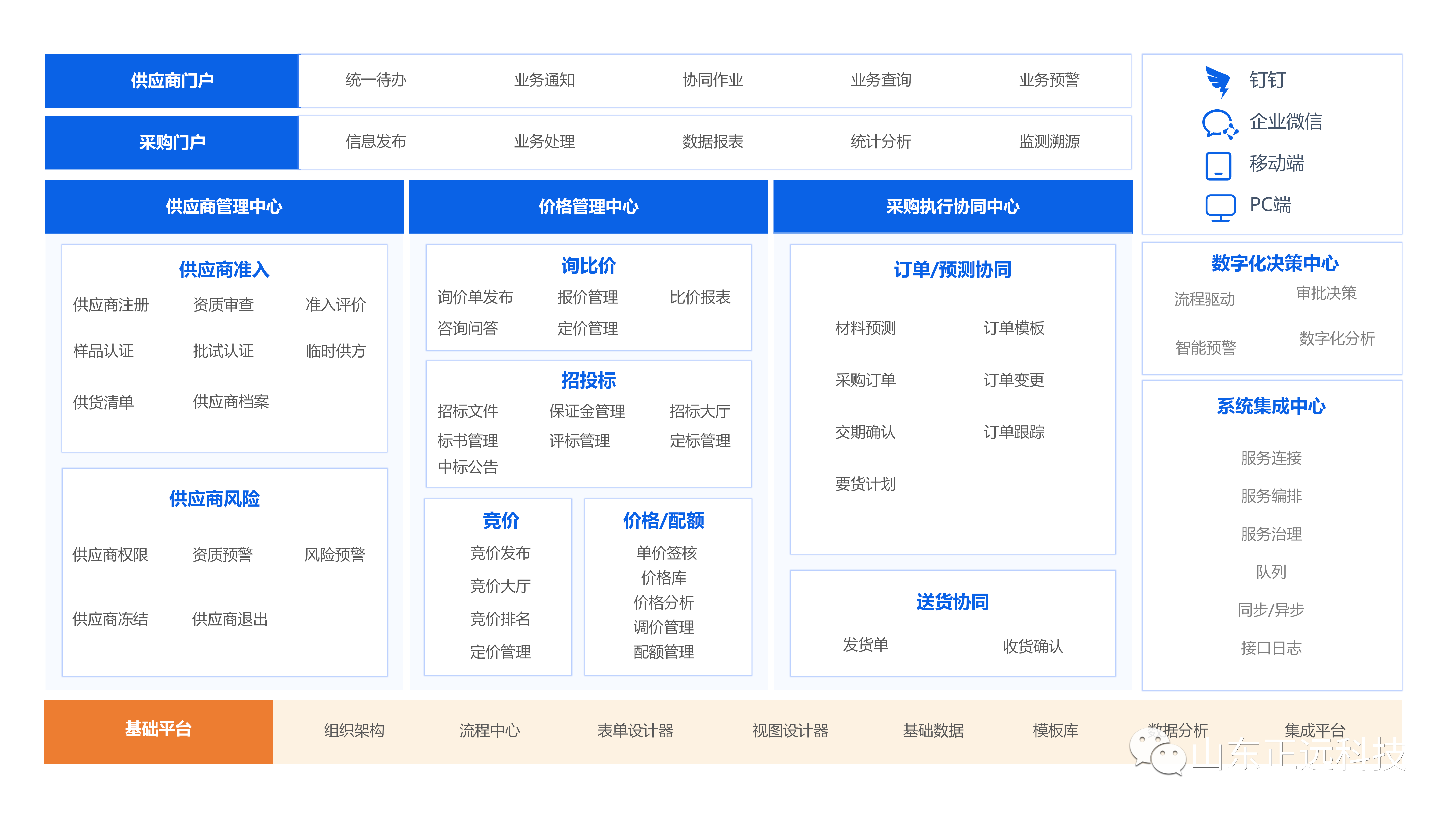 正远SRM标准版涵盖采购全业务流程管理,为企业打造一个内外统一的采供平台,实现采购业务的量化和可视化管理。