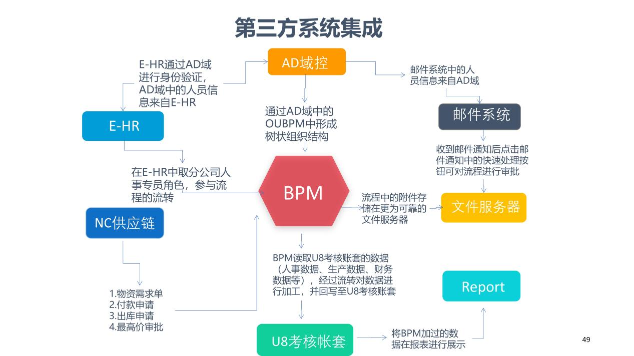 BPM集成多方系统,通过自身强大的数据融合能力和嵌入式流程功能可将分散于第三方系统的流程全部转化为BPM流程,为企业构建统一流程中心提供战略支撑。同时将分散于各平台的数据进行汇总为可视化报表,集团内部数据一目了然。